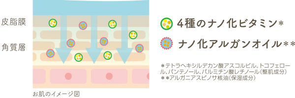 ナノサイズの美容液成分が角質層内深くまで浸透し、お肌のすみずみまでうるおいを届けます。
